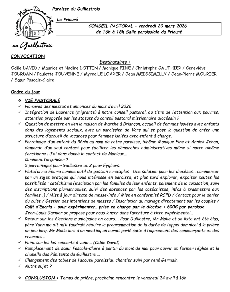Conseil pastoral du 20 mars 2026 : Convocation